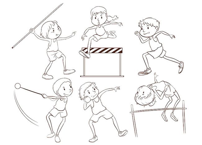 Disegni da colorare e stampare che rappresentano bambini e bambine mentre praticano: