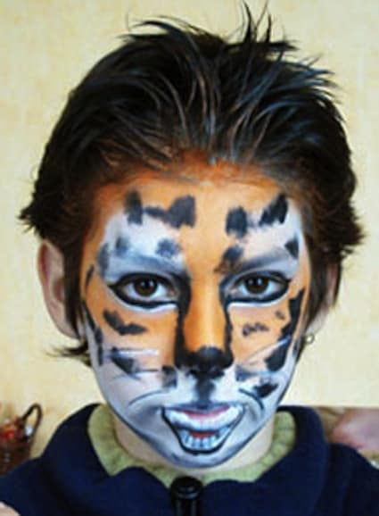- Trucco da tigre: strisce nere su fondo arancione con un tocco di bianco.