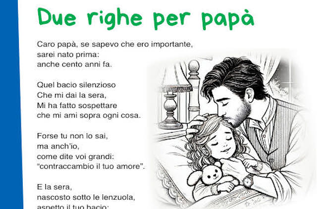 In questa pagina troverai una raccolta di poesie e filastrocche illustrate per la Festa del Papà da scaricare gratuitamente. Ogni poesia per il papà è accompagnata da un disegno da colorare, perfetto per aggiungere un tocco personale e creativo. Sono pensate per bambini della scuola dell’infanzia e della scuola primaria, con testi facili da memorizzare e recitare.
