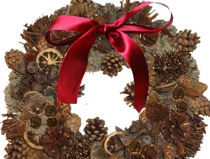Ghirlande fatte a mano con rami veri o finti, arricchite da fiocchi e pigne;
