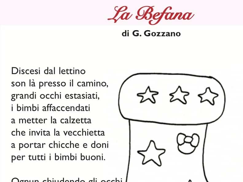 - Attività correlata: Invita i bambini a recitare la poesia mentre colorano un disegno della Befana o creano la loro calza personalizzata.