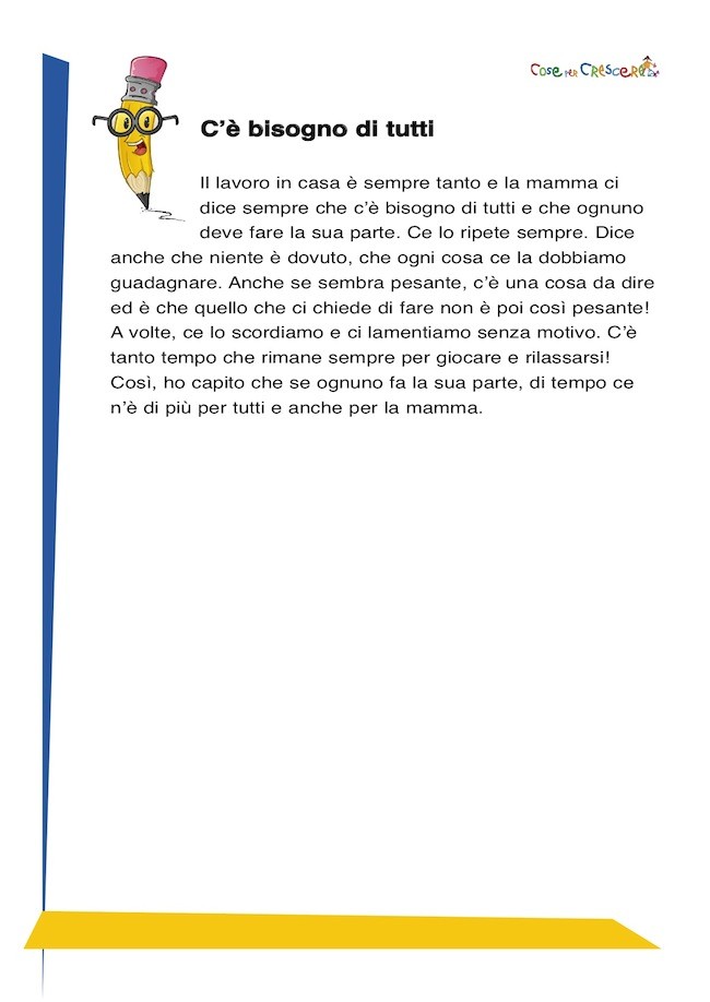 Anche se sembra pesante, c’è una cosa da dire ed è che quello che ci chiede di fare non è poi così pesante! A volte, ce lo scordiamo e ci lamentiamo senza motivo. E c’è tanto tempo che rimane sempre per giocare e rilassarsi. Così, ho capito che se ognuno fa la sua parte, di tempo ce n’è di più per tutti e anche per la mamma.