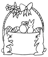 Un disegno da colorare per Pasqua: un grande cestino colmo di uova di Pasqua con 2 simpatici coniglietti un pò per