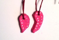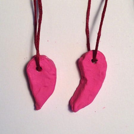 - Infilare un cordoncino in ogni mezzo cuore. I ciondoli sono pronti! I ciondoli possono essere ulteriormente decorati usando una tempera di un altro colore o con un pennarello. Noi abbiamo usato un pennarello colore argento!