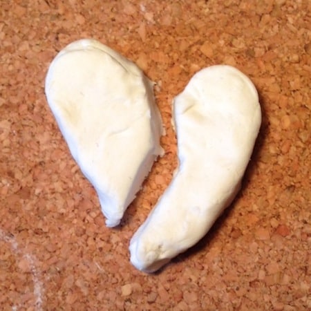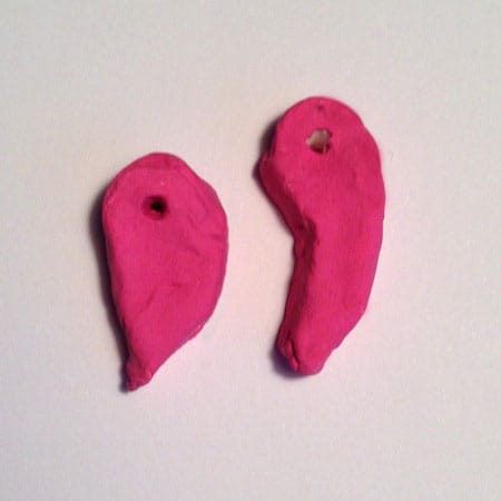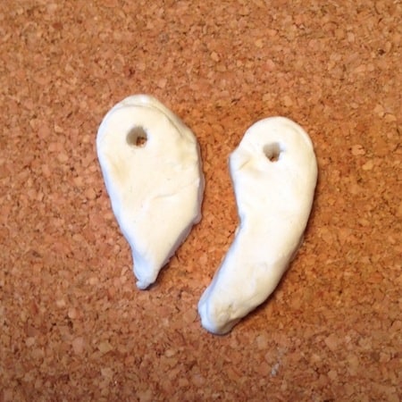 - Infilare un bastoncino (o uno stuzzicadenti) nella parte superiore di ogni mezzo cuore. Sarà il buco dal quale passerà il cordoncino. Lasciare asciugare.