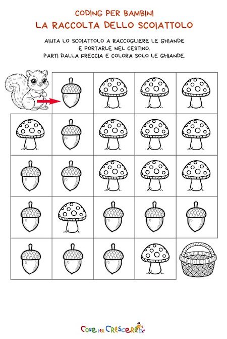 Scaricare e stampare la scheda di coding autunno per la classe prima è facilissimo. Una volta stampata, invita il bambino a colorare soltanto le ghiande che lo scoiattolo troverà lungo il suo cammino, iniziando dalla freccia e proseguendo fino al cestino.