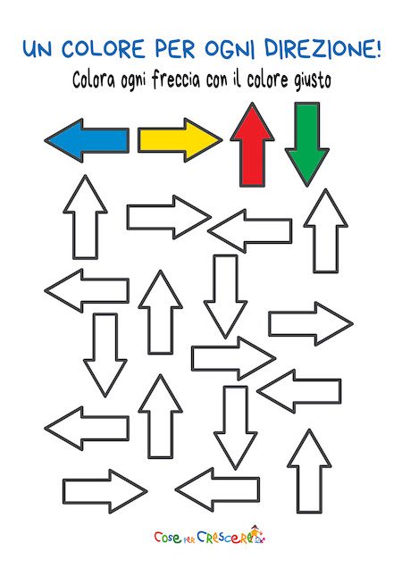 Chiediamo ai bambini di osservare le 4 frecce di diversi colori e, per ognuna di loro, indicare e colorare dello stesso colore tutte le frecce che vanno nella stessa direzione.