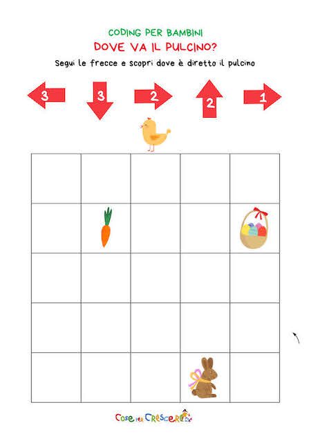 Per scoprirlo, i bambini dovranno seguire le frecce del percorso, contando con attenzione i passi e disegnando la strada del pulcino quadratino dopo quadratino. Un esercizio di coding offline perfetto per sviluppare il pensiero computazionale… divertendosi!