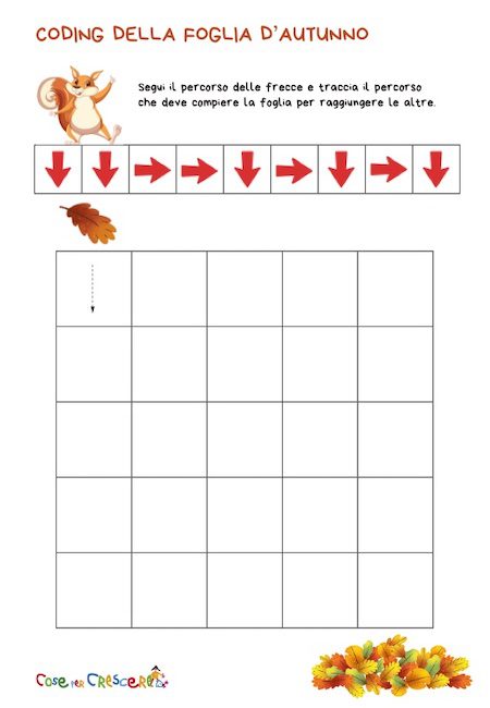 Il coding per bambini sull’autunno è un’attività educativa che combina divertimento e logica, aiutando i bambini a sviluppare importanti competenze di ragionamento. Questa scheda da scaricare e stampare gratuitamente permette ai bambini di apprendere le basi del coding attraverso un percorso stagionale a tema autunnale.