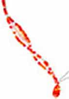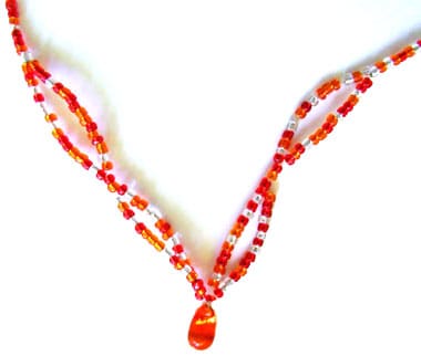 - Fare passare i 2 fili insieme in una perlina. Infilare nuovamente 14 perline (alternando i colori) su ognuno dei 2 fili. Fare passare i 2 fili insieme in una perlina… ripetere l’operazione fino a quando la misura della collana sarà quella giusta.
