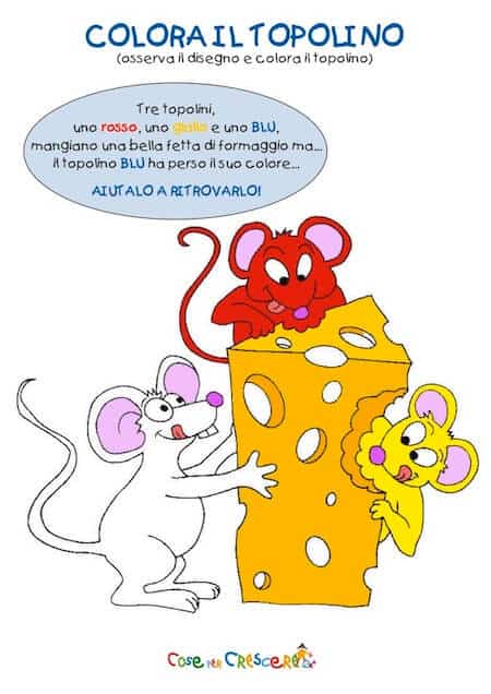 In questo disegno, tre topolini colorati, ognuno con un colore primario ma il topolino blu ha perso il suo colore! Il bambino dovrà aiutarlo a ritrovarlo.