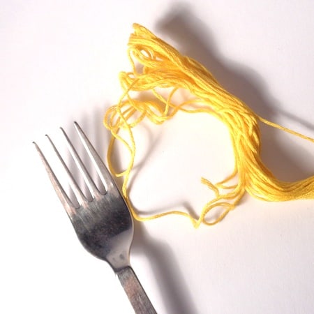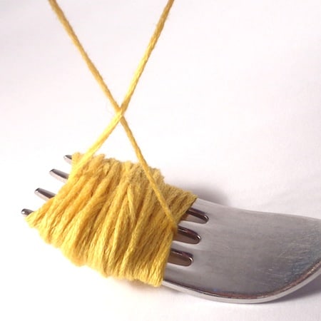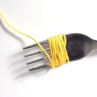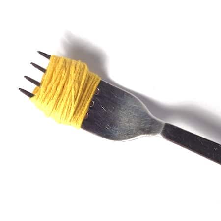- Tagliare un altro pezzo di lana di circa 20 cm di lunghezza ed infilarlo attraverso il foro centrale della forchetta, in mezzo alla lana avvolta.