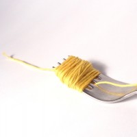 - Avvolgere la lana intorno ai denti (i rebbi) della forchetta. Tenere il filo di lana ben teso, bloccandolo con un dito, per il primo giro. Continuare, tendendo sempre la lana. PiĂą giri di lana si faranno, piĂą il ponpon sarĂ pieno e “ponposo”.
