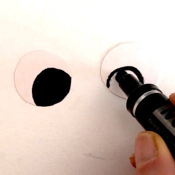 - Disegna 2 cerchi di circa 3 cm di diametro sul cartoncino bianco, disegna gli occhi con il pennarello nero (o la matita) e ritagliali.