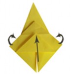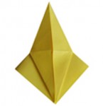 - Aprire i due lati piegati nella fase precedente e sollevare la punta inferiore del rombo. Aprire e appiattire in modo da ottenere un nuovo rombo più lungo e meno largo. Capovolgere. Fasi 8, 9, 10 e 11 dello schema.
