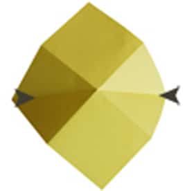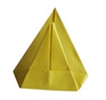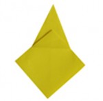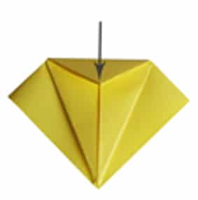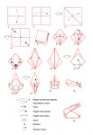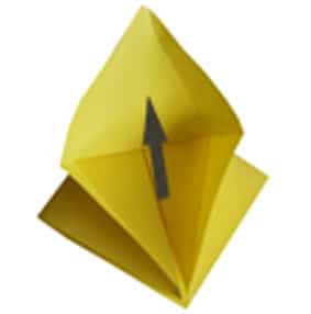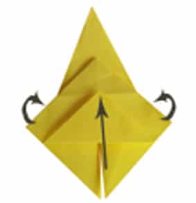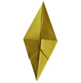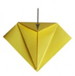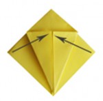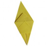 - Piegare la punta inferiore del rombo verso l’alto (non prendere i due spessori ma solo quello superiore). Piegare verso il dorso (verso dietro) i lati sinistro e destro. Si ottiene un rombo. Capovolgerlo. Fasi 12 e 13 dello schema.