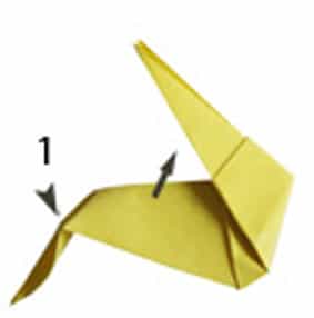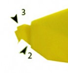 - Piegare verso l’alto un pò meno della metà della metà inferiore del rombo. Piegare il lavoro in due, nel senso dell’altezza. Dare forma al coniglio, sollevando la parte della “testa”. Aprire le orecchie. Fasi 14 e 15 dello schema.