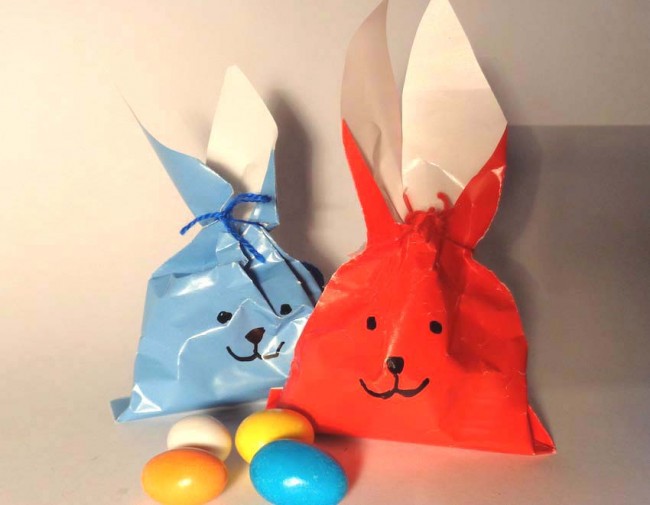 Coniglio sacchetto di PasquaUn’idea per confezionare velocemente piccole uova di Pasqua o cioccolatini in un buffo coniglio pasquale. Bastano un po’ di carta colorata (anche riciclata), un paio di forbici, colla, pennarello e nastro o filo di lana.