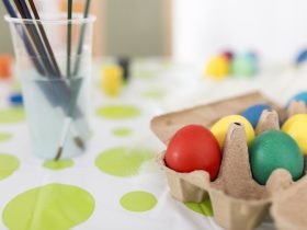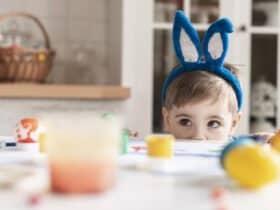 • Chiudere con un pezzo di nastro o filo di lana colorato. Con il pennarello, disegnare occhi e musetto del coniglio. Aprire e dare forma alle orecchie.