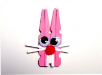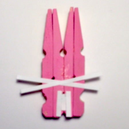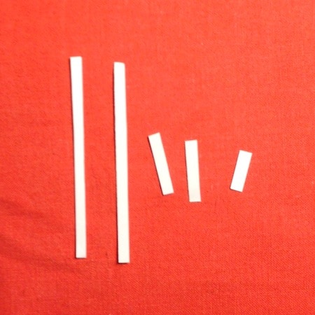 - Ritagliare una strisciolina di carta bianca di circa 0,3 cm di larghezza per 15 cm di lunghezza. Dividerla in 2 pezzi di circa 6 cm, 2 pezzi di circa 1,5 cm e 1 pezzo di circa 1 cm. Saranno baffi e denti del coniglio.
