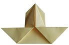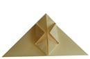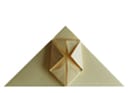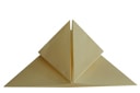 - Piegare le punte superiori verso il basso. Piegarle nuovamente, infilandole all’interno dei due triangoli più piccoli. Fase 7, 8 e 9 dello schema.