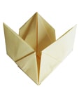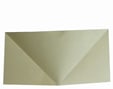 - Capovolgere il lavoro, piegate le punte laterali in maniera simmetrica facendo in modo che si congiungano nel mezzo. Fase 10 e 11 dello schema.