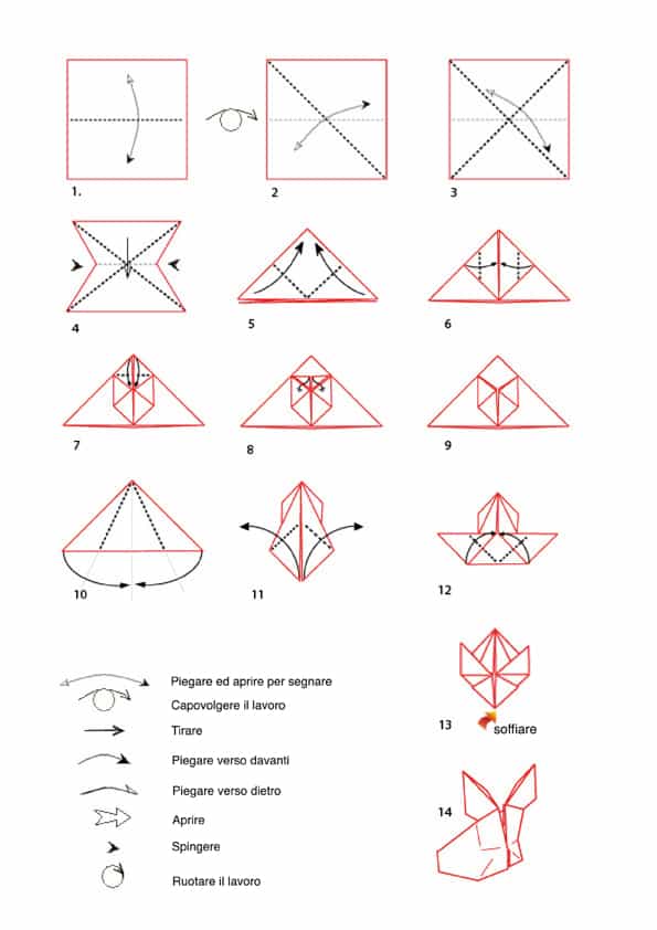 - Rialzare (piegandole) all’orizzontale le due punte inferiori. Piegare le due punte della base della forma ottenuta, verso la linea centrale. Gonfiare il coniglio soffiando nel buchino che si trova alla base della forma. Fase 12, 13 e 14 dello schema.