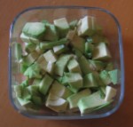 - Sbucciate l’avocado e tagliatelo a cubetti. Mettete i pezzetti di avocado in una ciotola con la metà del succo di limone. Mescolate in modo che non si ossidi e diventi nero.