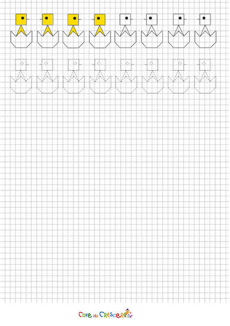 Una cornicetta per i bambini della scuola primaria, perfetta per il periodo della Pasqua e in primavera: una serie di pulcini appena nati e ancora nel loro guscio. Un disegno facile da fare seguendo le linee dei quadretti e da riprodurre allo stesso modo. Riprodurre e colorare immagini all’interno dei piccoli quadrati delle cornicette richiede precisione nei movimenti delle mani e delle dita. Questo contribuisce al miglioramento delle abilità motorie fini dei bambini. La suddivisione del disegno in quadretti favorisce inoltre la comprensione di concetti matematici come il conteggio, la sequenza e la geometria. I bambini possono sviluppare un senso di spazialità e imparare a seguire istruzioni dettagliate.