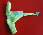 - Seguendo il modello dell’immagine, disegnate e ritagliate una forma di punta di freccia nel cartoncino verde. Incollate, pinzate o cucite la punta all’estremitĂ della coda.