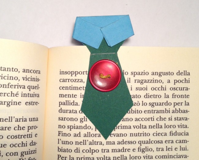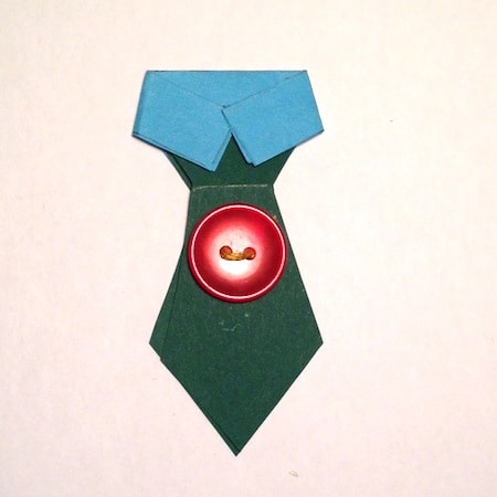 - Non resta che decorare la cravatta. Abbiamo infilato un filo colorato nel bottone che abbiamo incollato sulla cravatta.