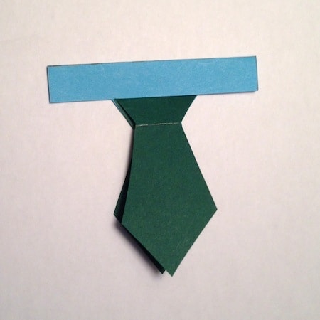 - Incollare la parte che esce dalla piega del collo della camicia sulla parte più alta del retro della cravatta. Le due sagome devono combaciare.
