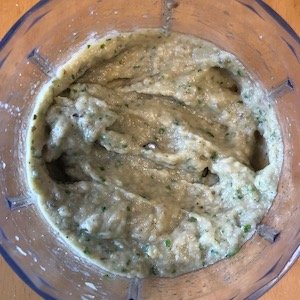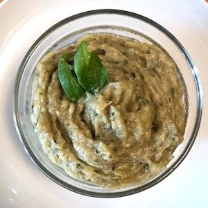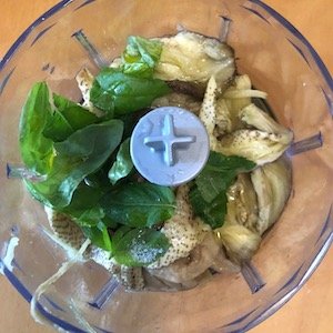 - Mettere la polpa di melanzana nel mixer, aggiungere lo spicchio d’aglio schiacciato, il basilico, la menta, sale e pepe q.b., un filo d’olio e frullare.