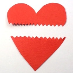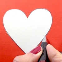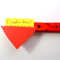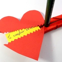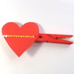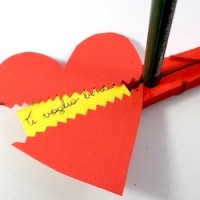 - Incollare l’estremità della parte destra della base del cuore sull’estremità del pezzo inferiore della molletta. Allo stesso modo, incollare l’estremità destra della parte superiore del cuore sull’estremità del pezzo superiore della molletta. Si può usare anche il bi-adesivo (forse più facile…). Per aiutare i bambini, ho “bloccato” la molletta con una matita. Fare in modo che la parte superiore copra il messaggio.