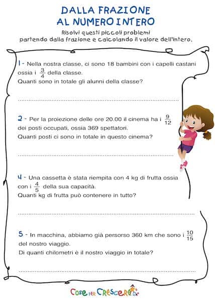 I bambini dovranno risolvere questi piccoli problemi, calcolando il valore del numero intero a partire dalla frazione.