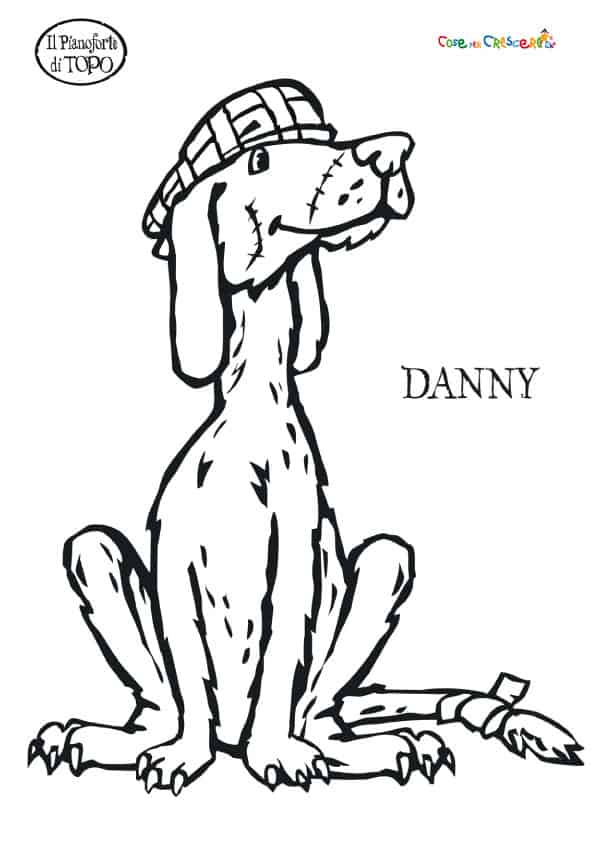 Danny il cane Disegno da colorare di Danny, il dolce cane randaggio dalle grandi orecchie e dal buffo cappellino, fedele amico del piccolo Topo, il protagonista della magica storia per bambini Il pianoforte di Topo. DISEGNO DA STAMPARE Cliccare sul disegno per stamparlo: