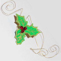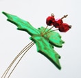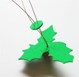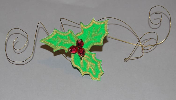 - Preparare 3 pezzi di filo metallico modellabile di circa 30 cm di lunghezza l’uno. Fissare una perlina nera a una delle estremitĂ di ogni pezzo di filo metallico (chiudendolo ad anello). Infilare una perla rossa in ogni filo metallico. Infilare ogni filo metallico (con il suo “frutto”) al centro delle finte foglie di agrifoglio.