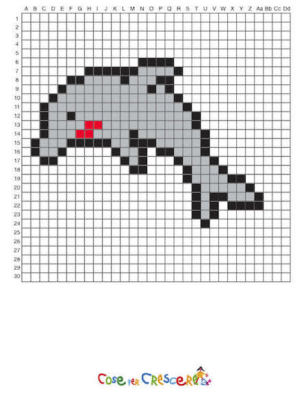 In questa pagina trovi il modello di delfino in Pixel Art e la griglia vuota da scaricare gratuitamente. Ti basterà seguire le istruzioni qui sotto!