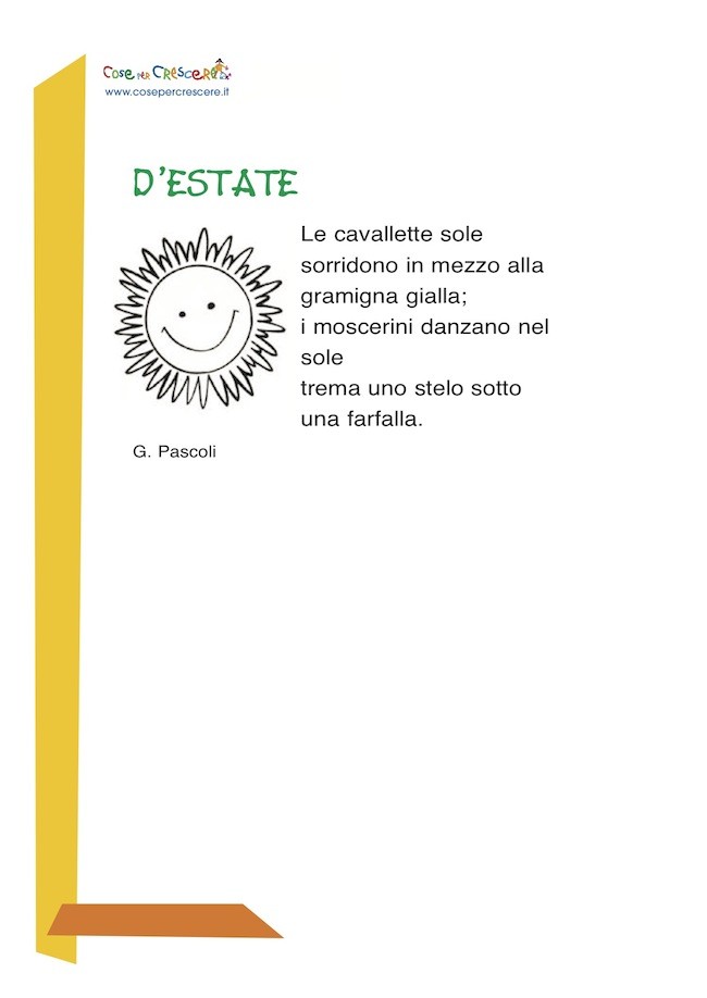 estate pascoliUna poesia per bambini sull’estate scritta da Giovanni Pascoli e facile da imparare perché molto corta. Una poesia da stampare gratuitamente e colorare.