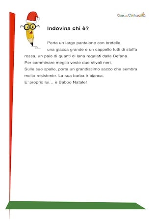 Porta un largo pantalone con bretelle, una giacca grande e un cappello tutti di stoffa rossa, un paio di guanti di lana regalati dalla Befana. Per camminare meglio veste due stivali neri. Sulle sue spalle, porta un grandissimo sacco che sembra molto resistente. La sua barba è bianca. E’ proprio lui… è Babbo Natale!