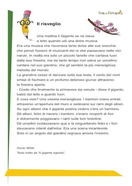 Un testo tratto dal racconto Il gigante egoista, scritto da Oscar Wilde, che si può proporre come Dettato sulla primavera per la scuola primaria, come lettura o per un’analisi e comprensione del testo. Scorrendo la pagina verso il basso, si può inoltre stampare una versione impaginata del testo.