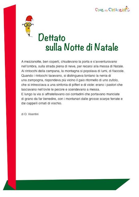 Un dettato sulla sera di Natale per la scuola primaria. Un testo con difficoltà miste, scritto da O. Visentini, che si può proporre ai bambini a partire della seconda elementare, da valutare in base alle conoscenze e possibilità dei bambini. Un dettato ortografico che proponiamo sia da leggere online che in una versione da stampare gratuitamente. Per leggerlo insieme o per un autocorrezione, sempre molto utile. Per stampare il testo, basta scorrere la pagina verso il basso e cliccare sul dettato dove segnato: si aprirà una seconda finestra con il testo in formato pdf, pronto per essere stampato e/o scaricato.