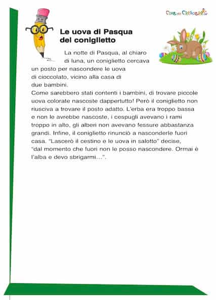 La notte di Pasqua, al chiaro di luna, un coniglietto cercava un posto per nascondere le uova di cioccolato, vicino alla casa di due bambini. Come sarebbero stati contenti i bambini, di trovare piccole uova colorate nascoste dappertutto! Però il coniglietto non riusciva a trovare il posto adatto. L’erba era troppo bassa e non le avrebbe nascoste, i cespugli avevano i rami troppo in alto, gli alberi non avevano fessure abbastanza grandi. Infine, il coniglietto rinunciò a nasconderle fuori casa. “Lascerò il cestino e le uova in salotto” decise, “dal momento che fuori non le posso nascondere. Ormai è l’alba e devo sbrigarmi…”.