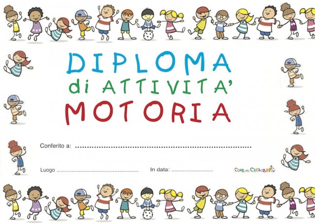 Diploma di attività motoria Un diploma di attività motoria da stampare gratuitamente, compilare e conferire ai bambini per premiarli, come ricordo di fine corso o come semplice incoraggiamento. Un diploma per bambini della scuola dell’infanzia o della scuola primaria. DIPLOMA DA STAMPARE Clicca sul diploma per stamparlo: