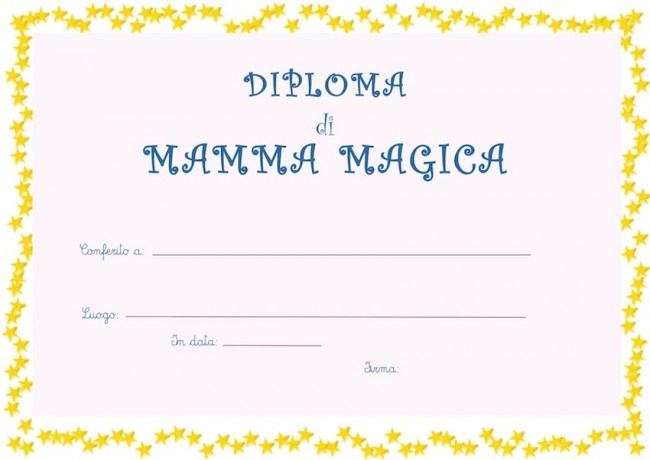 Diploma di mamma magica Un diploma per una mamma che riesce a fare tutto (insomma… come tutte le mamme!), un attestato di mamma magica da stampare e regalare alla mamma per la Festa della mamma, per il suo compleanno o per qualsiasi altra occasione. DIPLOMA DA STAMPARE Clicca sul diploma per stamparlo: