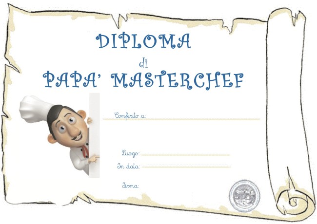 Diploma di papa’ Masterchef Un diploma di papà Masterchef da regalare ad un papà grande cuoco! Un diploma da stampare gratuitamente, compilare e regalare al papa’, magari avvolto in un bel nastro per ringraziarlo e dirgli quanto apprezziamo i suoi piatti deliziosi! DIPLOMA DA STAMPARE Cliccare sul diploma per stamparlo: