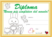Un diploma da stampare e regalare ad un nonno troppo ma troppo simpatico! Un nonno sempre allegro, che racconta tante cose divertenti e insegna un sacco di cose ai suoi nipotini. Un nonno che ride, scherza e che sa anche ascoltare. Un attestato per il nonno, da stampare, colorare, compilare e regalare per la Festa dei nonni, per il suo compleanno o solo per dirgli quanto gli vogliamo bene.