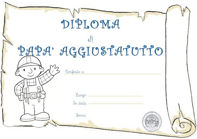 Diploma per papà aggiustatuttoUn diploma da stampare, compilare, colorare e conferire ad un papà aggiustatutto! Il papà che ci sistema la bici, il giocattolo che non funziona più, la lampada che non vuole più accendersi… e tante altre cose. Insomma, un magnifico papà aggiustatutto!