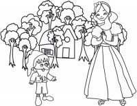 Disegno di Biancaneve davanti alla casetta dei sette nani, da stampare e colorare. Quando Biancaneve, che scappava nella foresta, arrivò in una radura e vide questa deliziosa casetta, decise di entrarci. La prima cosa che vide furono sette piattini sporchi, sette piccole sedie impolverate, sette camicine sporche e ragnatele e polvere ovunque. Pensò quindi che vi abitassero sette bambini senza mamma. Ma non era proprio così…