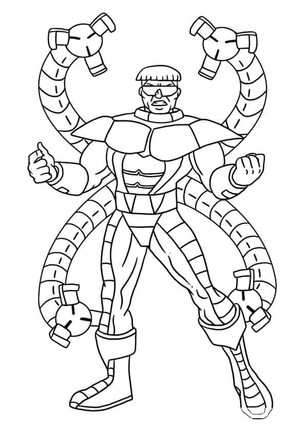 Un disegno del supercriminale Dottor Octopus, il cui vero nome è Otto Octavius. Grande scienziato e nemico di Spiderman, deve il suo nome di battaglia “Octopus” (significa piovra in inglese) a quattro lunghi tentacoli meccanici di sua invenzione e di enorme potenza. In seguito, i tentacoli diventeranno otto. Un disegno da stampare e colorare gratuitamente.